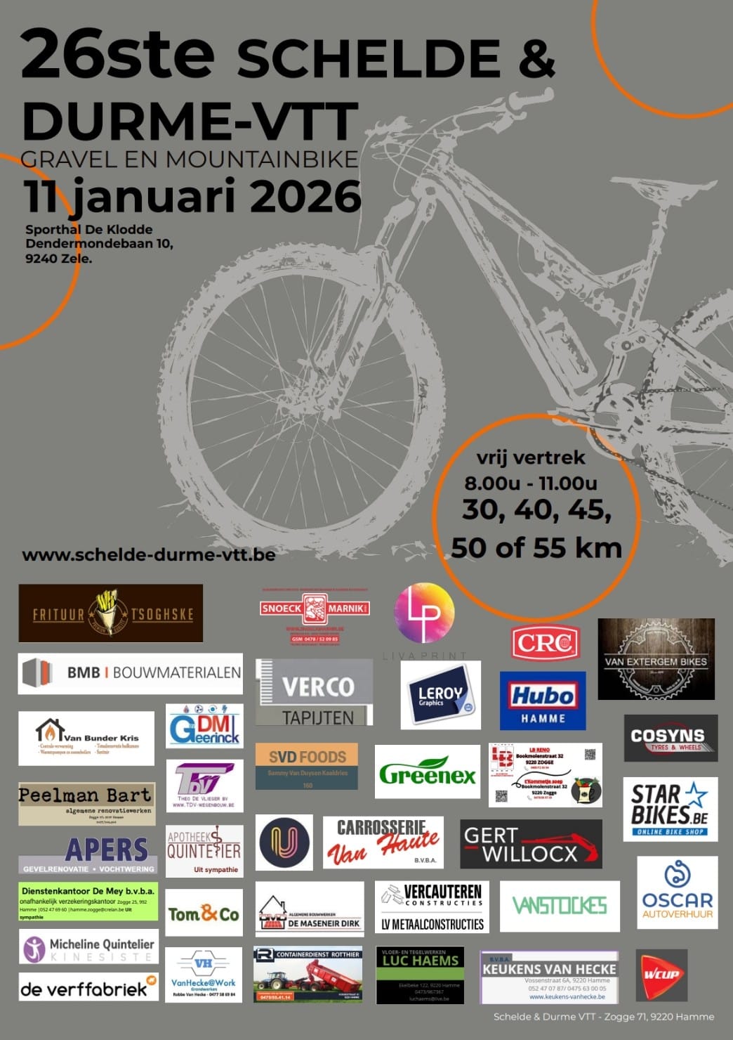 De jaarlijkse VTT- en gravelrit gaat dit jaar door op zondag 11 januari 2026. De startplaats is voorzien aan sporthal De Klodde, Dendermondebaan 10, 9240 Zele. Inschrijven kan op zondag 11 januari van 8 tot 11u. Dit telkens in de cafetaria.
